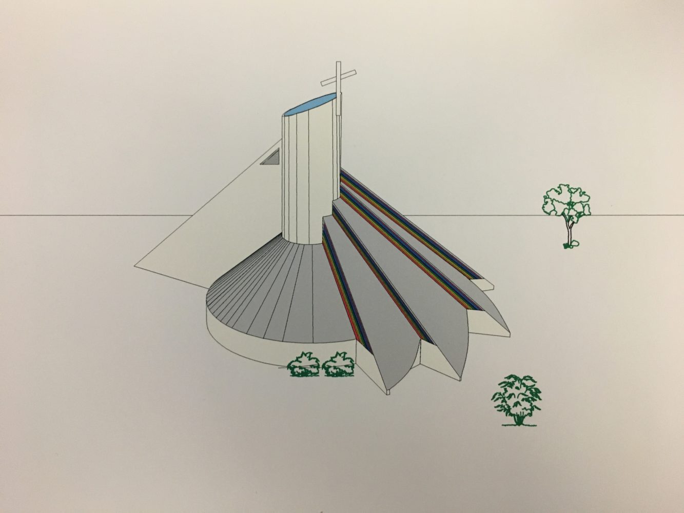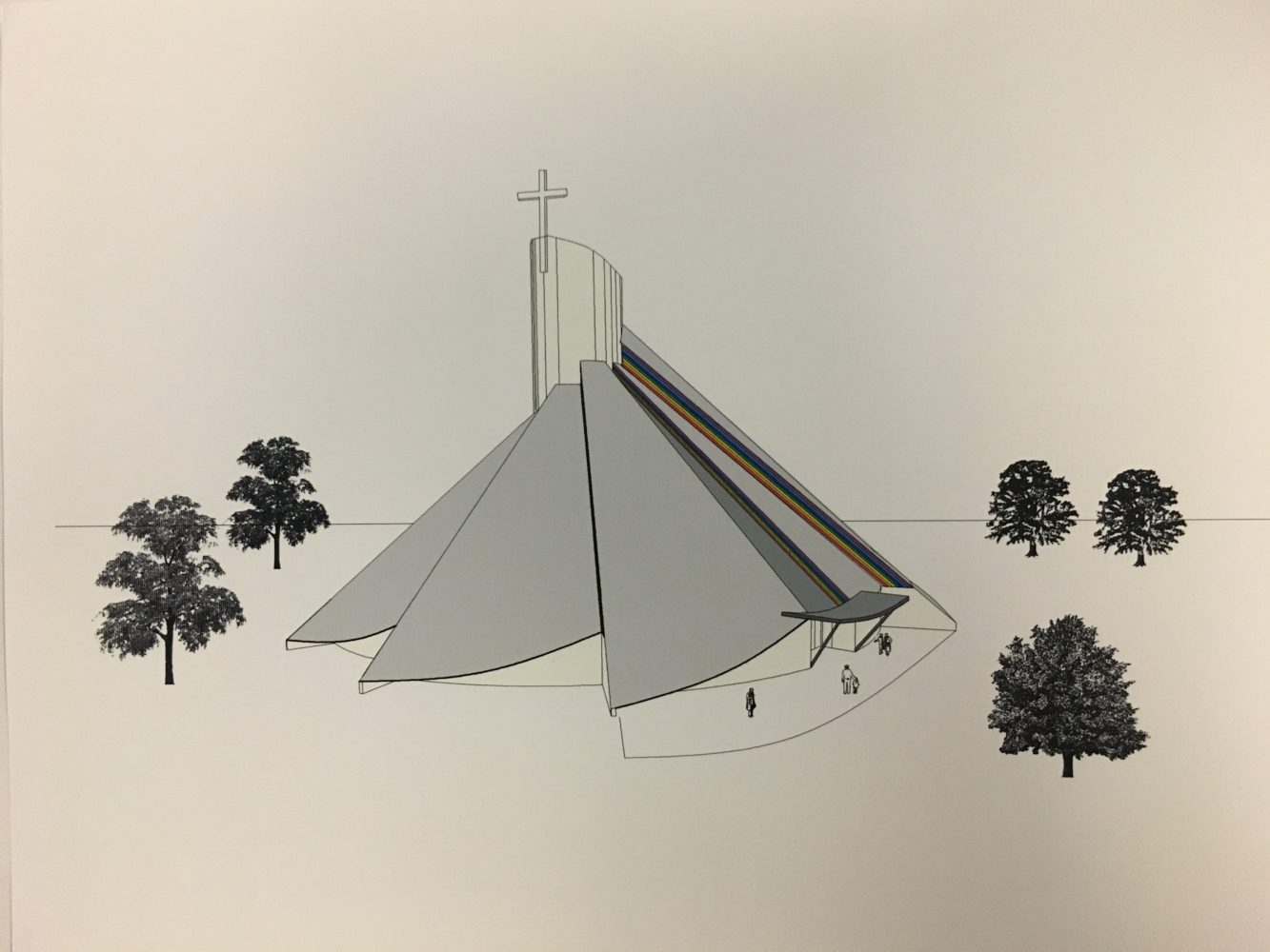 La forme elliptique met le chœur au centre de l’assemblée, il se développe comme un éventail décentré. Le maximum de fidèles est ainsi rapproché du centre d’où part la parole et le souffle. L’église devient plus participative, et plus représentative de ce vers quoi elle évolue. L’architecture doit pouvoir y participer de manière modeste en se mettant au service des assemblées qui viennent y manifester leur espérance.