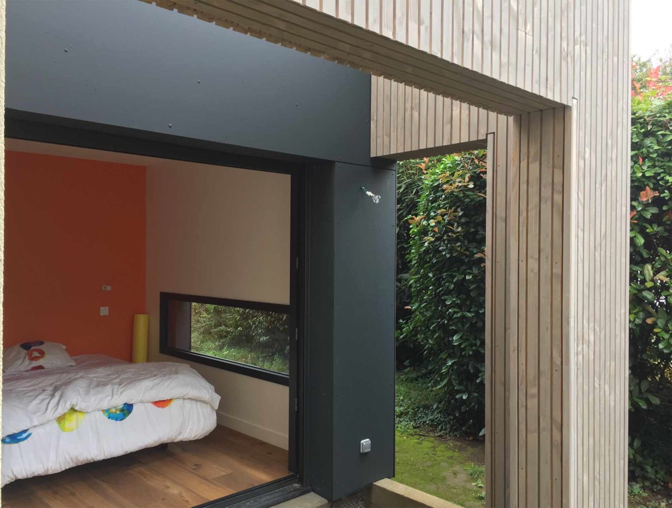 Ce projet consiste en l’extension d’un pavillon pour y créer une suite parentale de plain pied et relooker complètement l’habitation existante. Afin de diminuer l’impact sur le terrain et avoir une rapidité d’exécution, la technique de la construction en ossature bois a été retenue. Les matériaux apparents en façade sont des panneaux de résines de type Fundermax teinte gris anthracite, apposés à côté d’un bardage naturel de type Sivalbp lasuré d’usine gris clair. A noter sur ce projet dans la chambre parentale un châssis panoramique horizontal à hauteur de lit. Les menuiseries ont ainsi été étudiée de manière à ouvrir l’espace intérieur sur un agréable jardin.